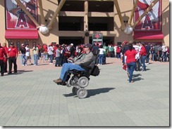 Kim and I are both big Red Sox fans; I have the accessibility routine down pat at Fenway Park. On the night before we flew back to Maine from Los Angeles we caught the Sox playing in Anaheim, only 45 minutes away from the airport. It is a fine, modern stadium, and the people were all kind. They were particularly enamored of my iBot. We got there two hours early, as is standard practice when we attend games in Boston. We like to soak in the ambiance at Fenway before the first pitch. It's such an energized atmosphere, steeped in history (Fenway will celebrate its 100th birthday next year). It was a bit different, however, watching a baseball game in Southern California. The experience was pleasant, but not high-energy. If Angels Stadium is Josh Groban, Fenway Park is Steven Tyler.